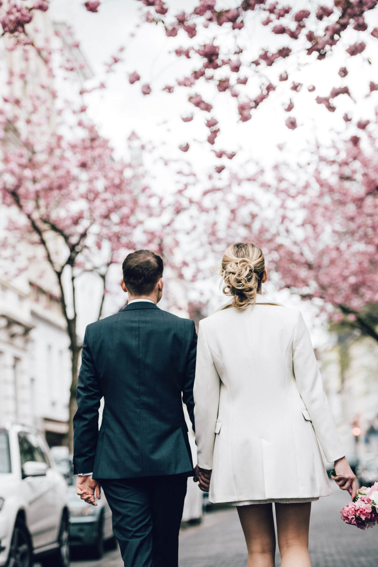 Hochzeitsfotos / Hochzeitsreportage zur standesamtlichen Trauung in Bonn und besonderes Paarshooting an unterschiedlichen Plätzen der alten Bundeshauptstadt zur Zeit der Kirschblüte.
